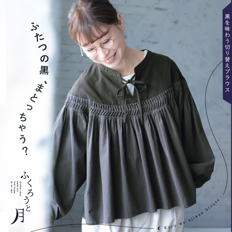 黒と、スミクロ。2つの魅力を、とことん引きだしたブラウスです。顔まわりは、“黒”ですっきりと。キーネックデザインで大人の抜け感を出しました。胸から下は、やさしい“スミクロ”。ぐるり一周あしらったピンタックや、ギャザーのふんわり感がとっても繊細な表情です。2つの黒が出会ったら、こんなにも味わいゆたか。黒ってやっぱり奥深い!