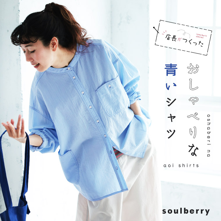 店長がつくった、おしゃべりな青いシャツ レディース ブラウス 長袖 バンドカラー ノーカラー 綿 コットン トップス