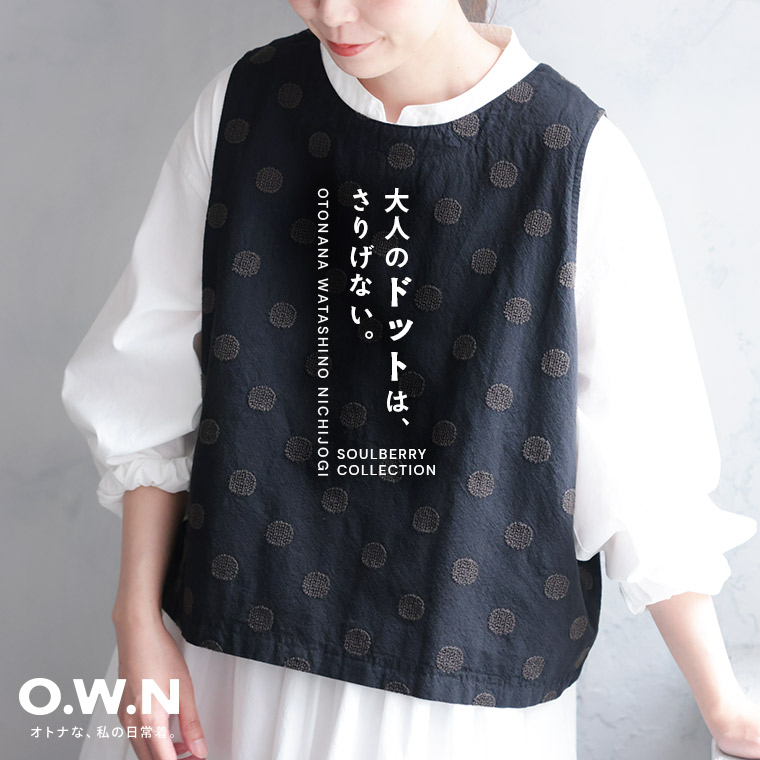 ドットって可愛いけれど、子どもっぽい?今の自分に馴染む“大人のドット”を考えてみました。ほんのり浮かび上がるような、微配色と刺繍のぽつぽつ。このさりげなさがちょうどよくて、大人も躊躇せず手に取れます。とってもいいドットが出来たのでベストのデザインも前後2WAYで色々着まわせるようにしちゃいました!
