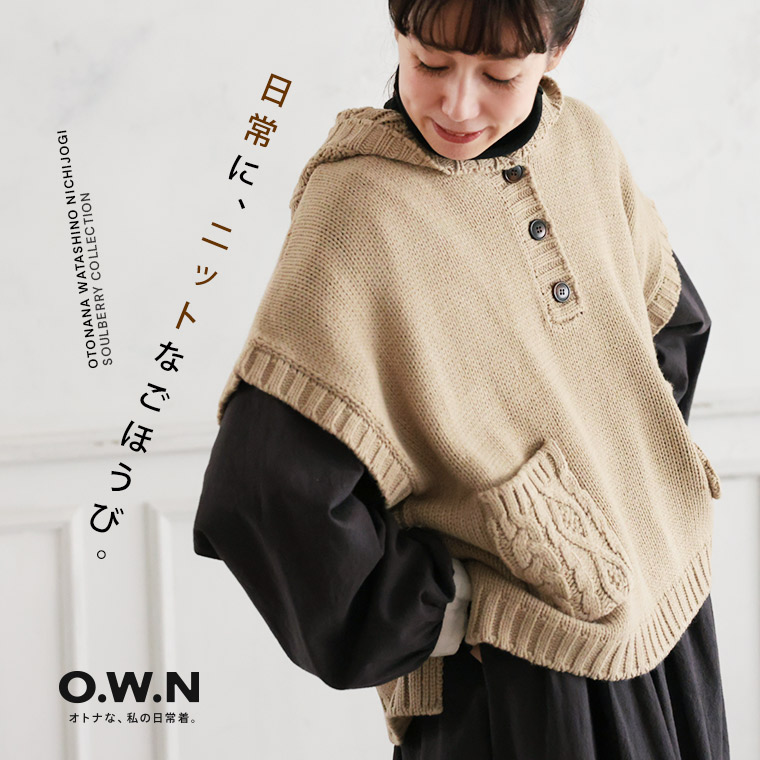 O.W.N ケーブルポケットなニットベスト レディース ノースリーブ フレンチスリーブ フード付き ケーブル編み トップス