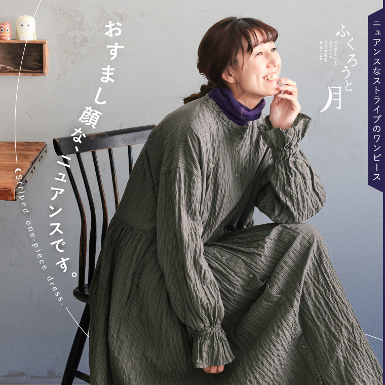 ふくろうと月 ニュアンスなストライプのワンピース レディース シャツワンピース ロング フレア Aライン 長袖 キャンディースリーブ スタンドカラー