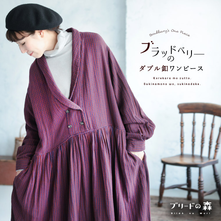 ブリードの森 ブラッドベリーのダブル釦ワンピース レディース ロング フレア Aライン 長袖 ショールカラー 綿 コットン ギンガムチェック