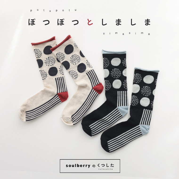 靴下くらいは、羽目を外したっていいよね。soulberryの靴下は遊び心がいっぱい!ぽつぽつ手描き風のドットとストライプ、どちらも大好きな柄を組み合わせてみました。チラッと見える配色だって、ちょうどいいスパイス。足もとからコーデを楽しめる、お茶目さたっぷりのデザインです。
