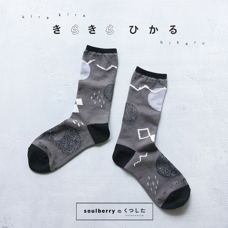 靴下だけは、羽目を外したい。soulberryの靴下は遊び心がいっぱい!抽象的な柄が歩くたびにきらきら光る靴下です。繊細なラメ糸を編み込んだので光り方もさりげなく、どこか上品。落ち着いた配色だけど、無難じゃない。大人の靴下遊びはこのくらいがちょうどいいんですよね。