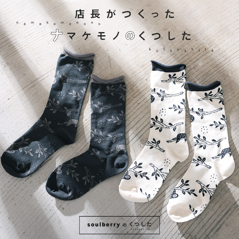靴下だけは、羽目を外したい。soulberryの靴下は遊び心がいっぱい!ゆる〜い仕草で、なんだかこっちまで脱力しちゃうようなナマケモノの柄。今までありそうでなかった柄を靴下にしてみました。茶目っ気たっぷりだけど、モノトーンだからさりげない存在感。靴下にほっこり癒される日常も、アリかもしれません(笑)