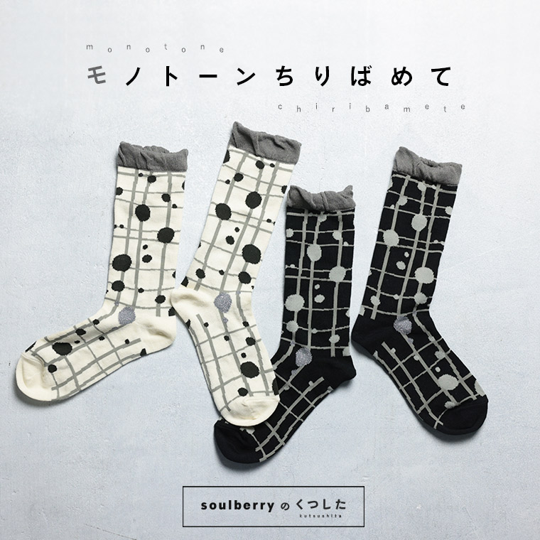 靴下だけは、羽目を外したい。soulberryの靴下は遊び心がいっぱい!モノトーンのチェックとドット、2つが織りなすリズムが楽しげな靴下です。ところどころにラメのドットをちりばめて大人の上品さもちらり。ただのモノトーンじゃつまらない、そんなわがままを叶えました。