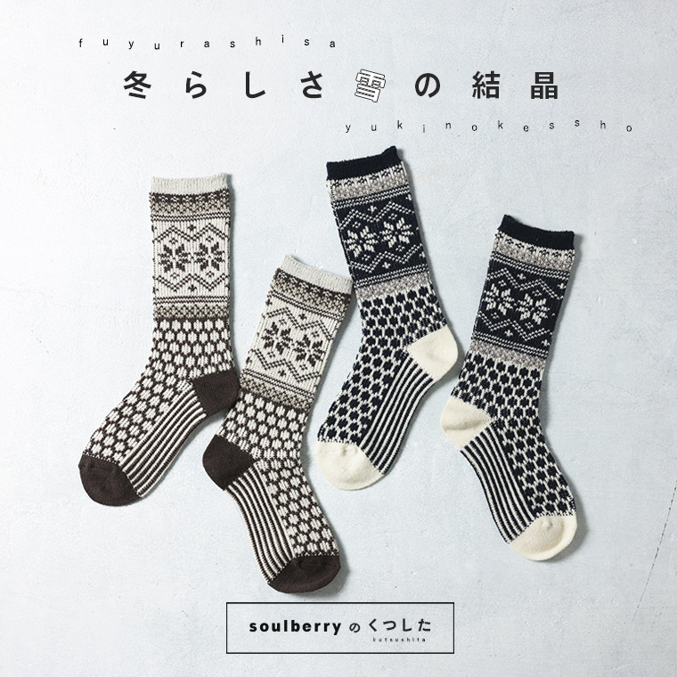 靴下だけは、羽目を外したい。soulberryの靴下は遊び心がいっぱい!雪の結晶を描いたノルディックな柄が季節感たっぷり。ほっこりしたデザインだけど、配色や余白のバランスですっきり大人の雰囲気に仕上げました。足もとから楽しめる、冬の風物詩です。