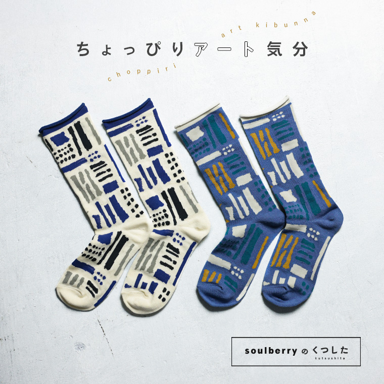靴下だけは、羽目を外したい。soulberryの靴下は遊び心がいっぱい!たくさん並んだ手描き風のラインが、ちょっぴりアートな気分にさせてくれます。すっきり爽やかな配色は足もとのちょうどいいアクセント。ボトムや靴とのバランスで柄の印象が違って見えるのもおもしろい。思わず鑑賞したくなっちゃう靴下です。