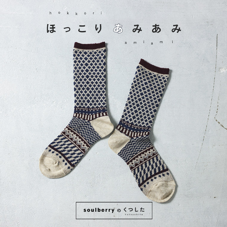 靴下だけは、羽目を外したい。soulberryの靴下は遊び心がいっぱい!秋冬といえば、やっぱりハズせないノルディック柄。柄の繊細さや、あえて寒色系の配色でどこかすっきり大人っぽい印象に仕上げました。ほっこりだけじゃない大人のスパイス、足もとで効かせてみない?