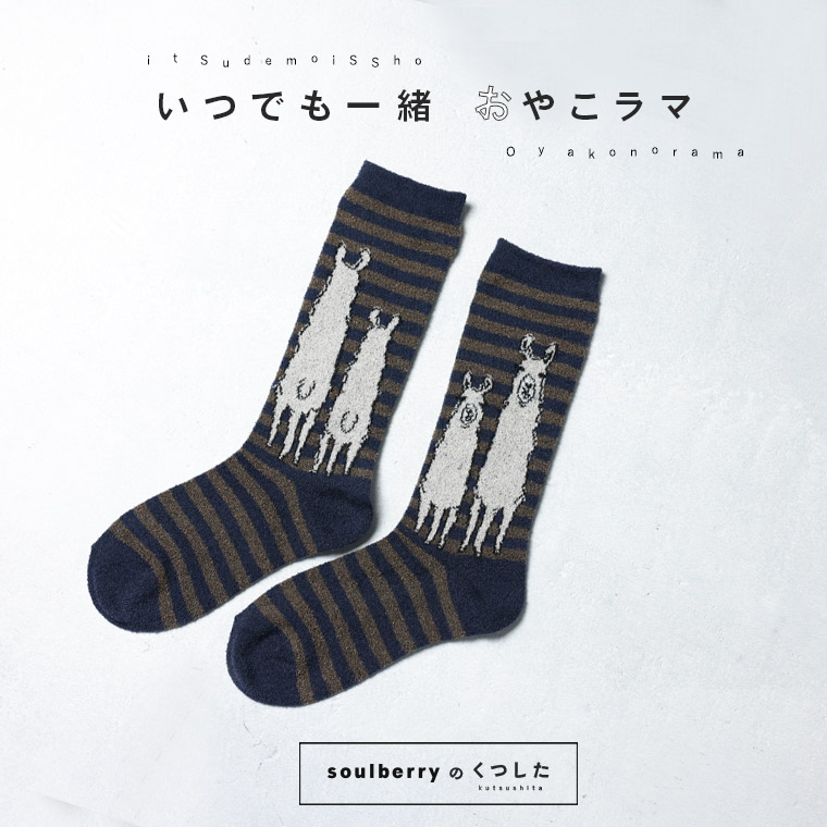 靴下だけは、羽目を外したい。soulberryの靴下は遊び心がいっぱい!なかよし親子のラマに、思わずほっこり。ボトムの裾から、このとぼけた顔がチラッと見えるのがたまらない〜!内側にはラマの後ろ姿がちゃんと描かれていてぽってりしたお尻もキュート。履くたびにほのぼの気分になれる靴下です。