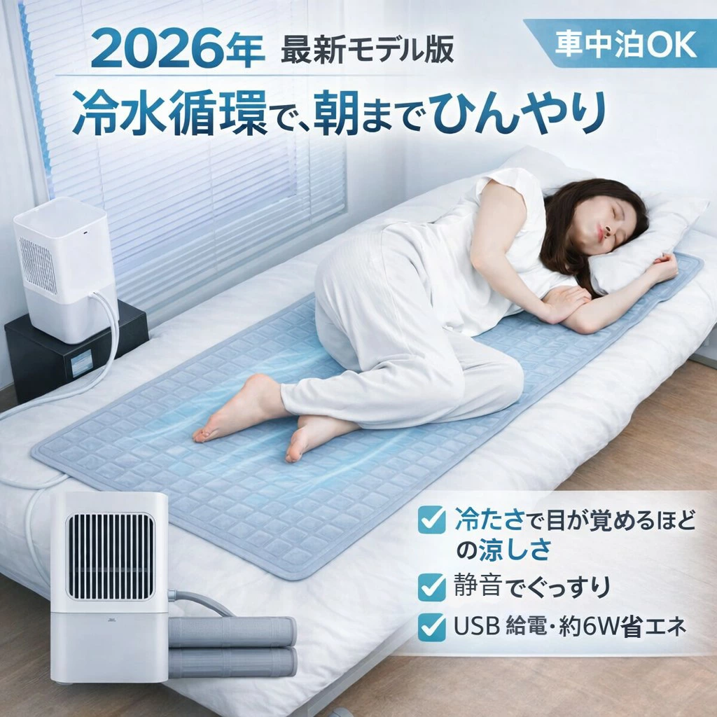 過熱保護、水不足時、停電時の自動シャットダウン機能を搭載。表面温度は室温より約3〜8℃低く、水冷マットレス・水流マットレス感覚で使えます。シングル・ダブル対応で、寝室、寮、車中泊、キャンプ、防災備蓄にもおすすめです。