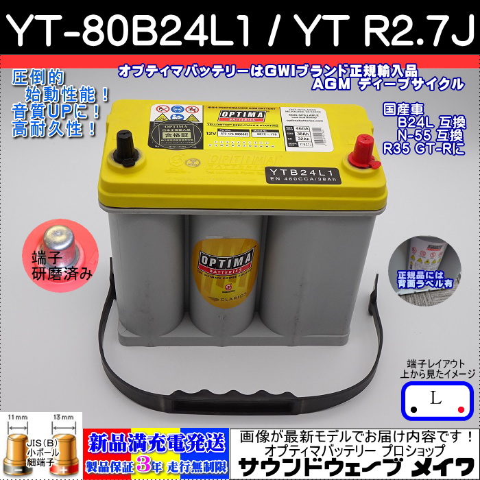 オプティマ バッテリー イエロー OPTIMA YT-80B24L1 / YT R-2.7J / 国産車用 B24L N-55 互換 (L型,B端子) (GWI 正規品 3年保証)