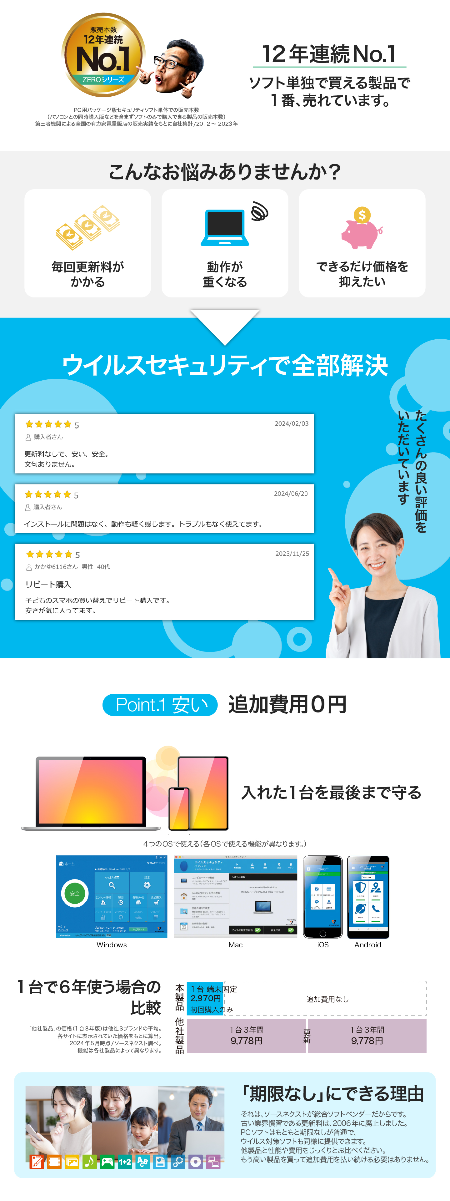 かかる費用は初回の購入時だけ。ZEROは入れた1台を最後まで守る、期限なしのセキュリティソフト・ウイルス対策ソフトです。