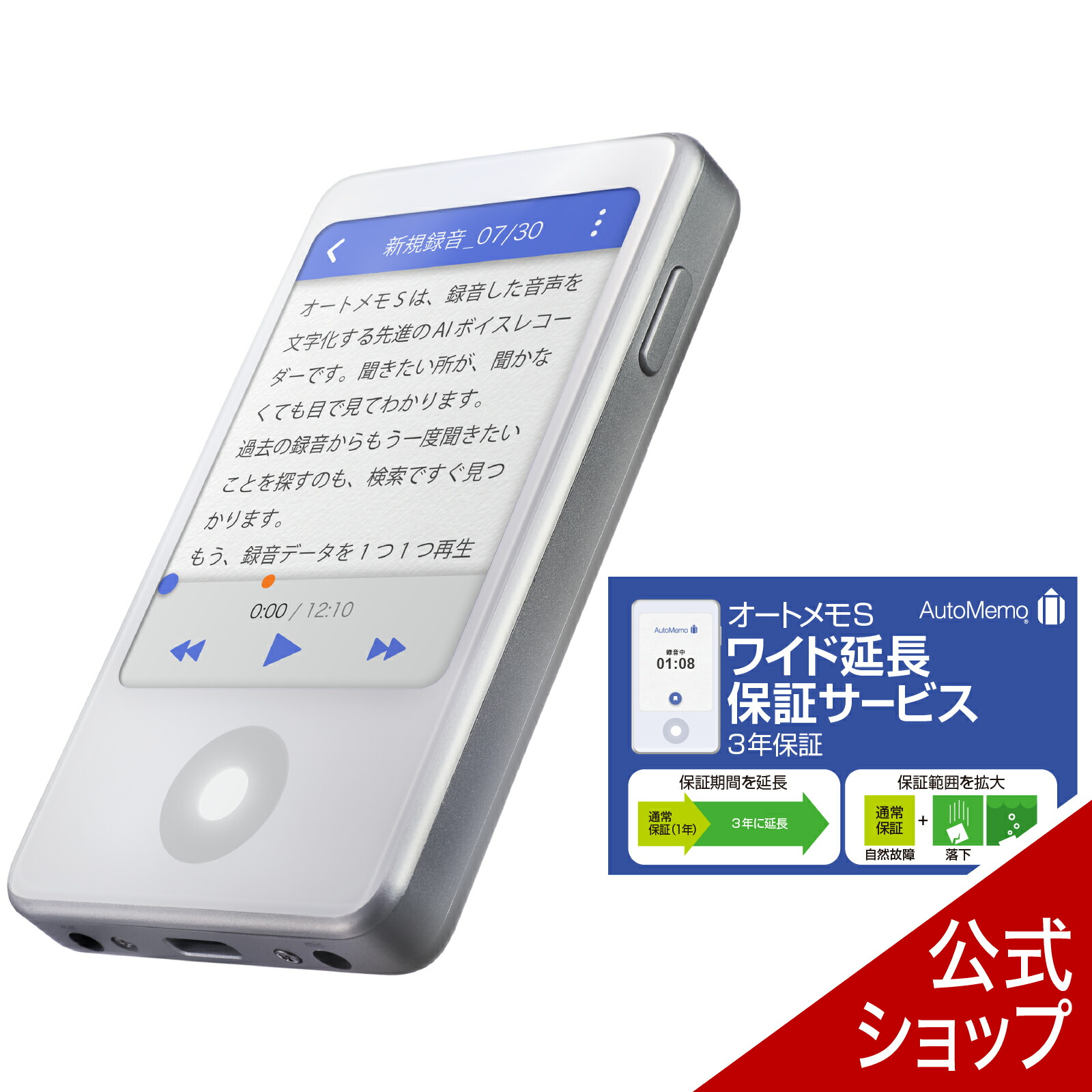 AutoMemo (オートメモ) S 」は、録音した音声を自動で文字起こしするAIボイスレコーダーです。本製品は「AutoMemo (オートメモ) S」本体と「延長保証サービス」のセット商品です。