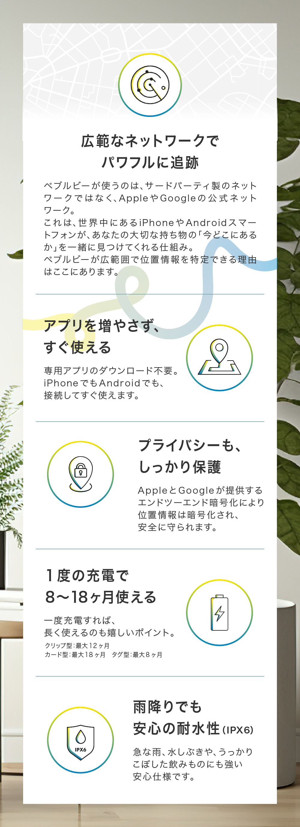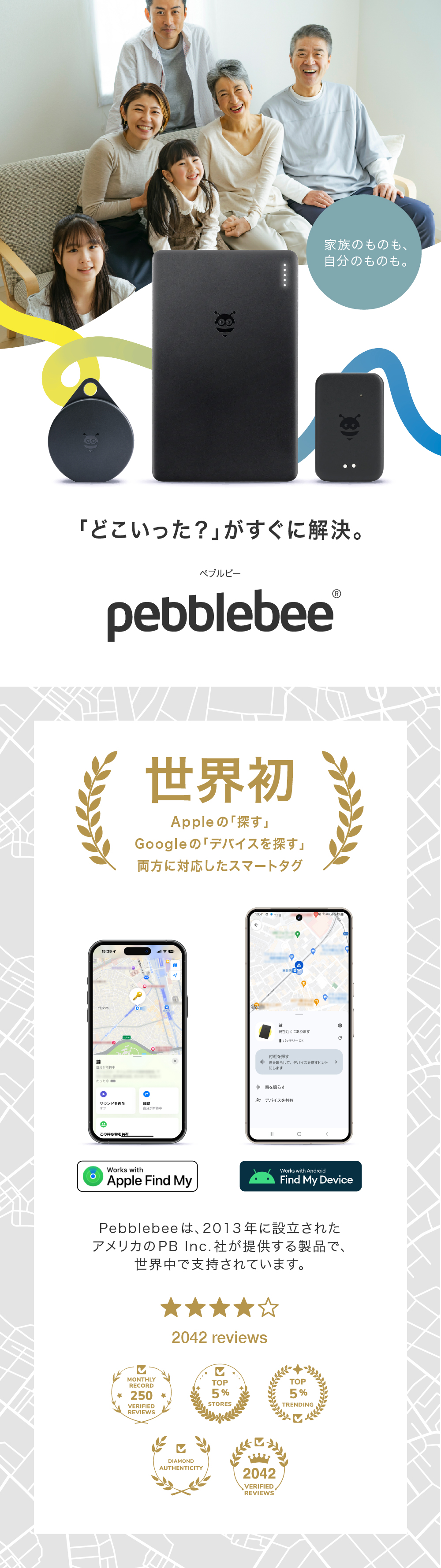 ポイント2:「Pebblebee」は取り付けて初期設定するだけでApple標準の「探す」アプリ、またはGoogle標準の「デバイスを探す」アプリのどちらからでも探すことができます。