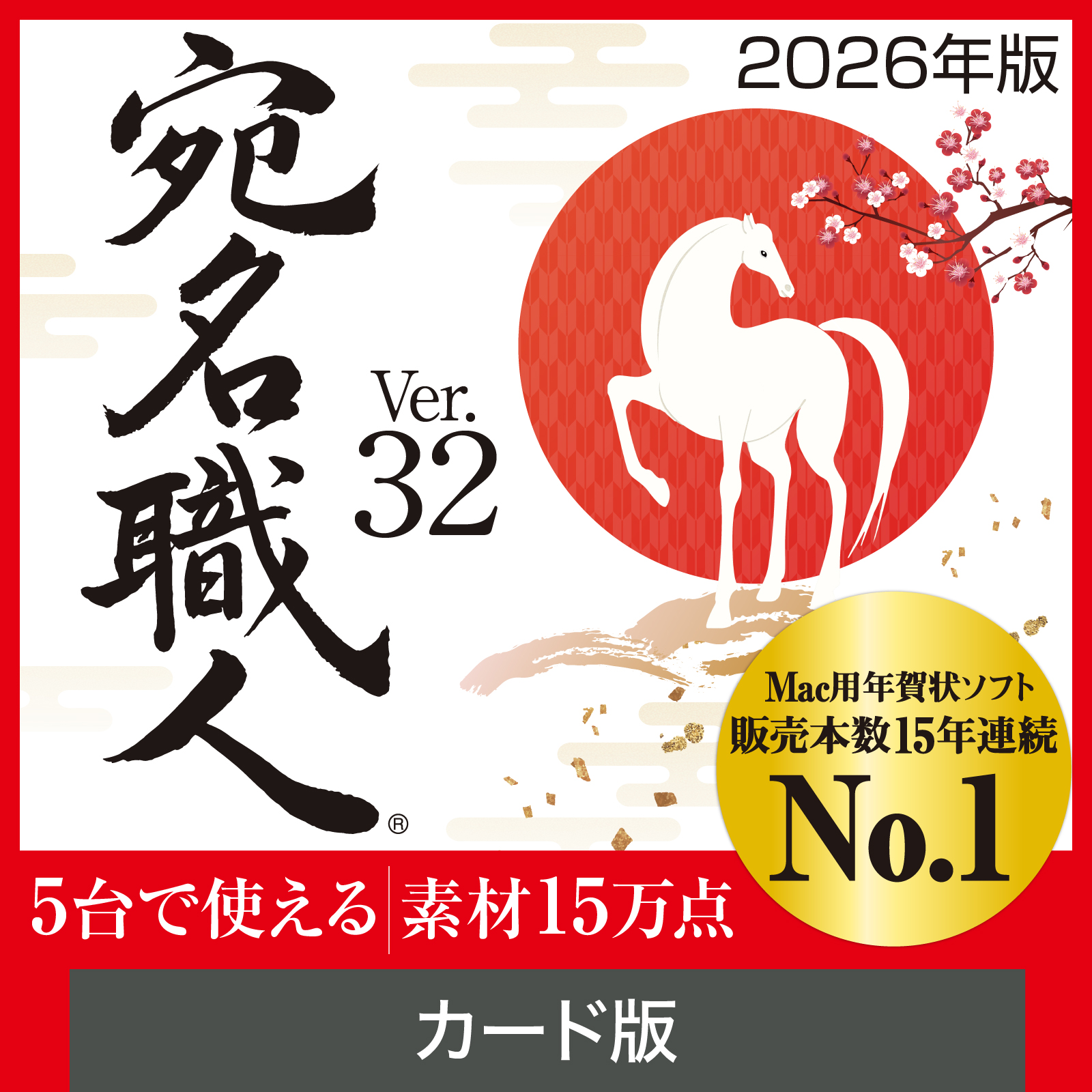 ポイント1:定番のMac用年賀状ソフト「宛名職人」がパワーアップして新登場。Macとの高い親和性、2026年午年のデザインを中心に15万点の素材を収録。