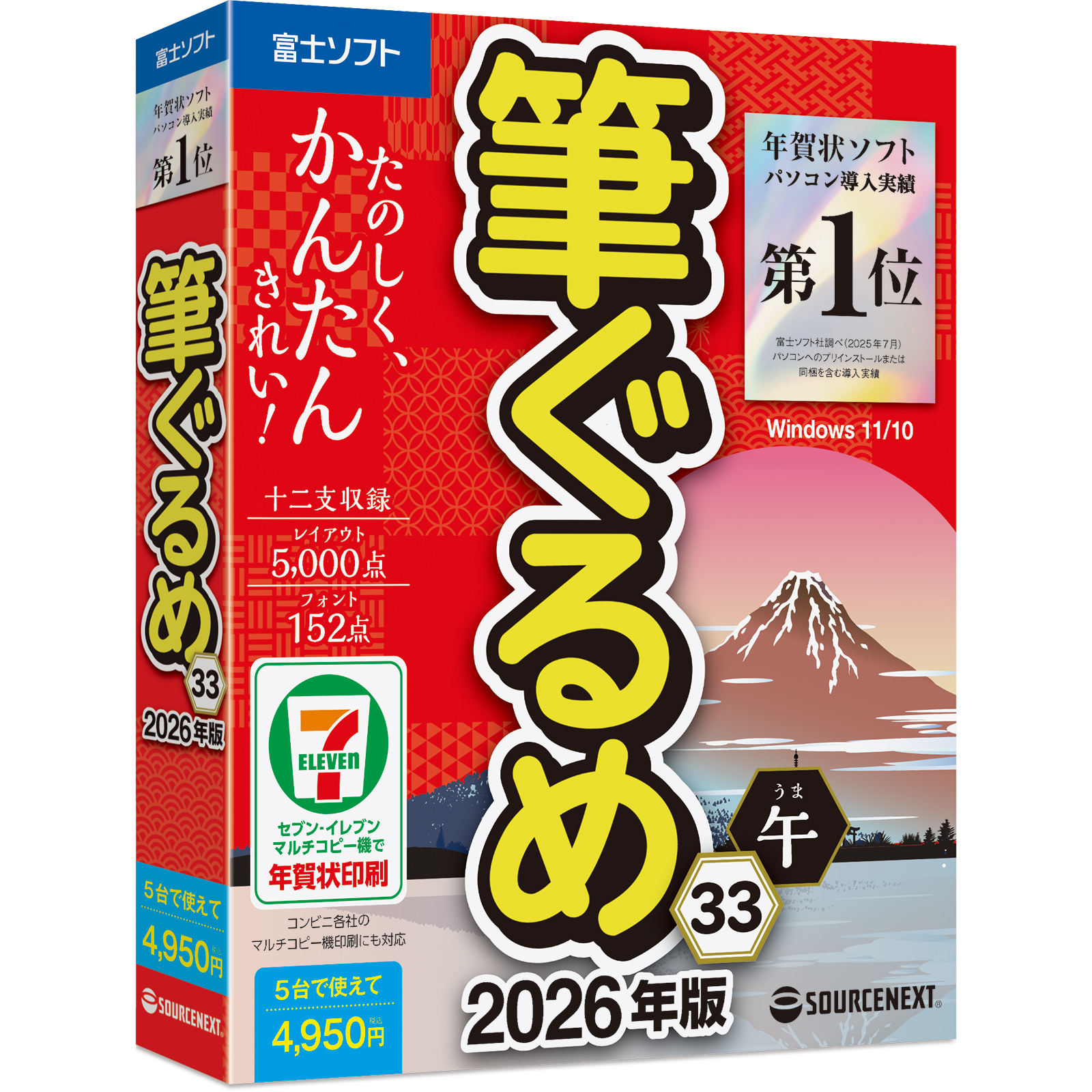 「筆ぐるめ 33 2026年版」は”たのしく・かんたん・きれい”がコンセプトの初心者でもかんたんに使える年賀状ソフトです。書家監修のレイアウトで宛名を綺麗に配置、2万点以上の素材やフォント152書体を収録しています。