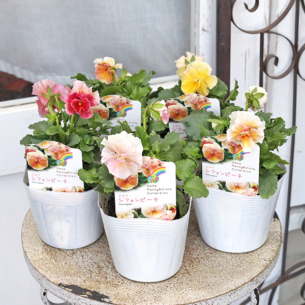 花苗 ビオラ シフォンピーチ 3.5号 パンジー うえた育種 ピンク イエロー パステル おしゃれ よく咲く アンティーク 冬 春 庭