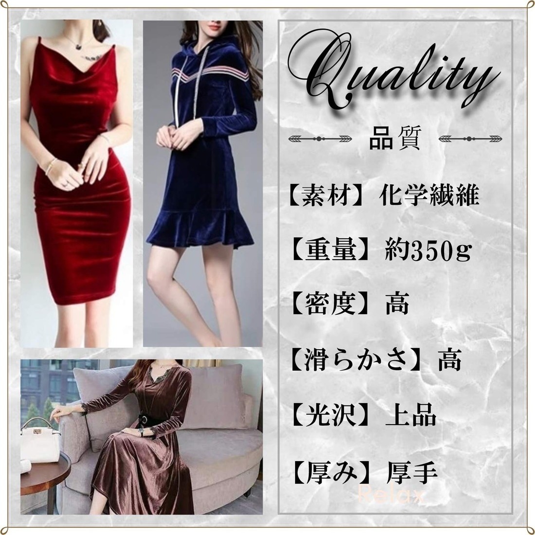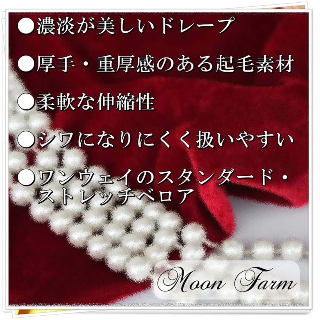 ・高級感溢れる光沢が魅力のスタンダードベロア生地。通常のベロア生地よりも厚手・重厚感があり、耐久性も綿麻製品の約5倍。長くお使いいただけます。 ・柔軟な伸縮性をもつ1WAY(ワンウェイ)のストレッチベロア。幅150cmの方向に伸び、最大約240cmまで伸ばすことが可能です。 ・シワになりにくい特性なので、体のラインが出るようなお洋服にもおススメです。 ・全16色とカラーバリエーションも豊富。衣服・ドレス・コスプレ・学校行事・ディスプレイなど幅広くご活用いただけます。 ・手芸・手作り小物・ハンドメイド DIYはもちろん、写真撮影時の背景的な用途としてもご使用可能です。*生地の縁に、裁断過程で生じる小さな穴がある場合がございます。ご了承ください。 AFO-AWB