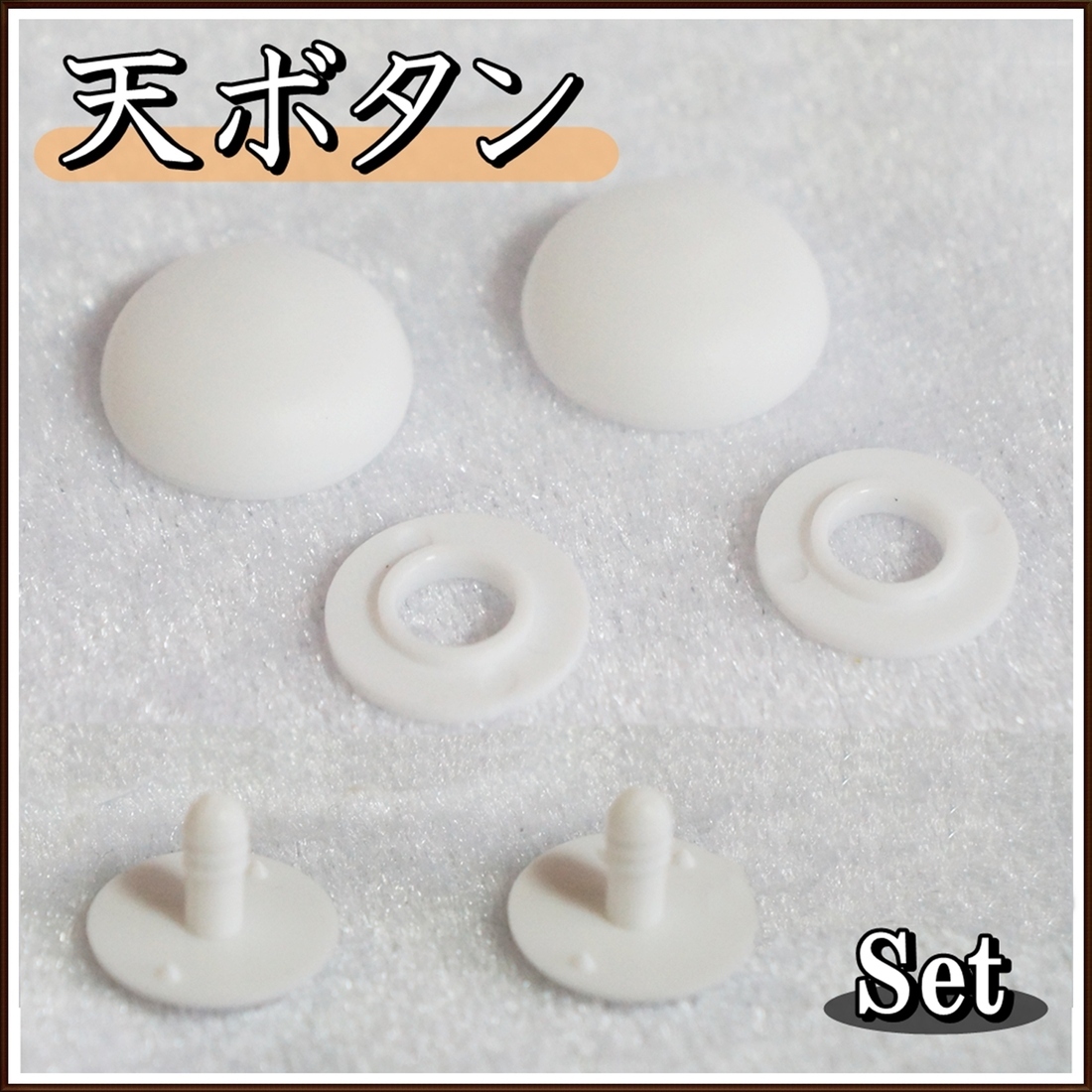 ・キャップやハットの天辺部分のボタン。国産 内側からピンで差し込むタイプとなります。(頭・ワッシャー・ピン)の3点セット。製造国:日本 頭実寸:17mm・日本で最も一般的に使われている大きさで、スタンダードな天ボタンです。色:ホワイト ・天ボタンとは、キャップやキャスケットの頭頂部についているボタンのことを指します。デザイン的な意味合いもありますが、縫い合わせを補強するためのパーツでもあります。 ・自作のお人形やぬいぐるみなどの飾りボタンや小物のアクセントとしても利用でき、かぶせる布を変えるだけで簡単にオリジナルのボタンが出来ます。手芸全般に使って行けます。 ・※手作業で生地をくるむ事も可能ですが、ハンドプレス機・丸抜きポンチ等を別途用意して頂けると楽に取り付けられます。 ・小さいパーツでピンは先端が尖っているので踏んだりしないよう注意して下さい。また、幼児の手の届かない所に保管して下さい。誤飲の恐れが有ります。