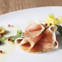 輝きがあり透明感のある赤身と霜降りのコントラスト、柏幻霜ポーク特有の脂の旨味とナッツの香りが凝縮された惣左衛門の熟成生ハムは、一流の料理人からも高く評価されています。