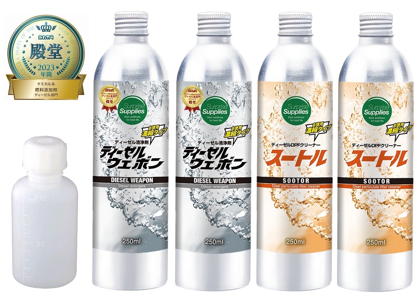 4本セット ディーゼルウェポン250ml×2本、スートル250ml×2本 計量ボトル付 オイル添加剤 燃料添加剤 ディーゼル 軽油 ハイエース等 ディーゼルウエポン