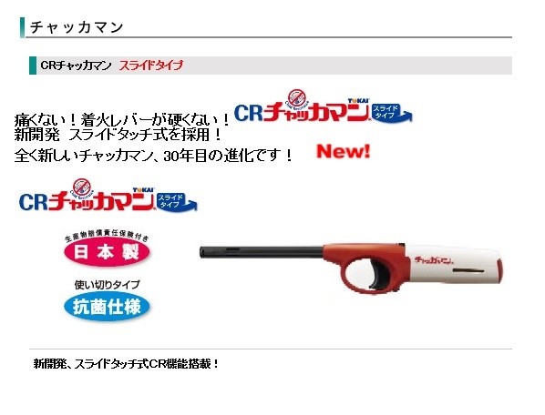 スライド式、従来のCR機能つきライターより力がいらず、着火できるタイプです。。コンロへの着火に。ろうそくやお線香に。花火などへの着火に。