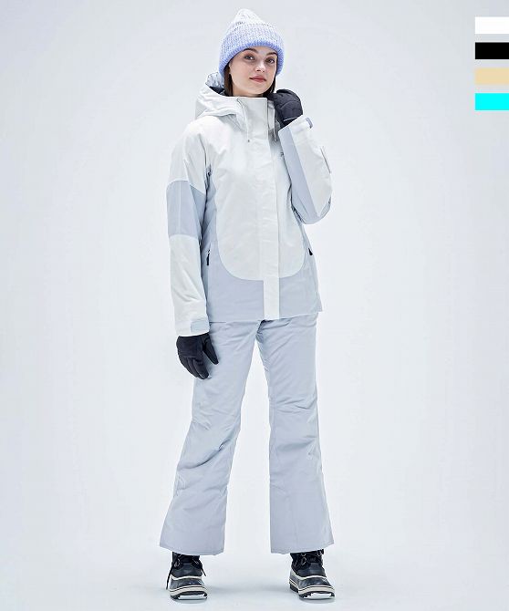 バイカラーデザインの2ピースウェアー。耐水圧10000mmの2WAYストレッチ生地を使用。取り外し可能なサスペンダーやウエスト脇のサイズ調整アジャスター付き。