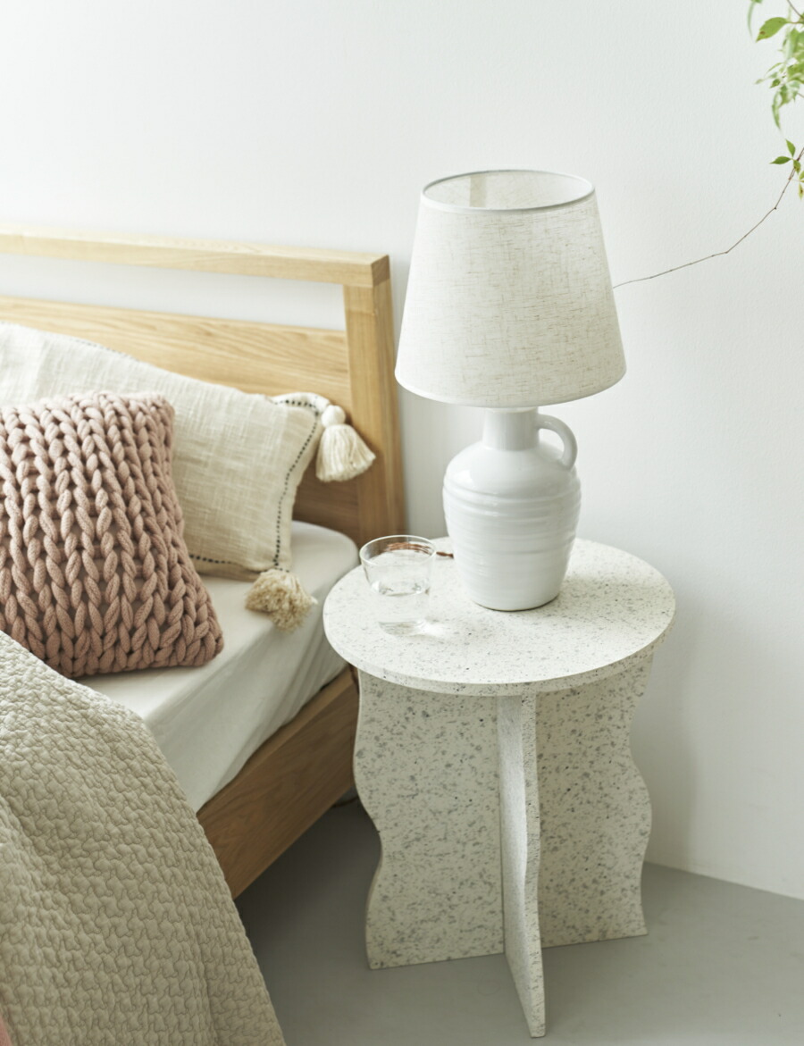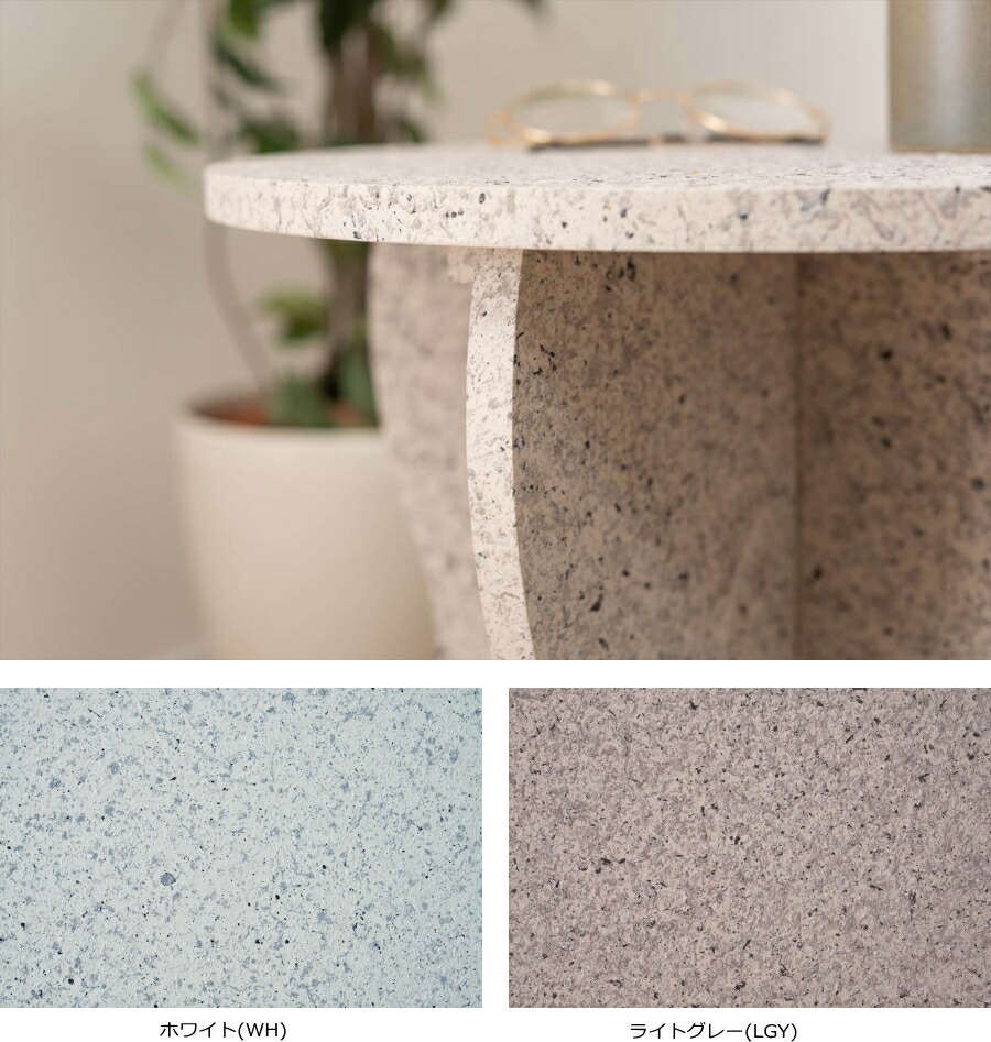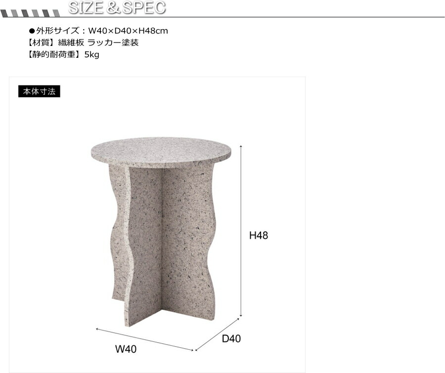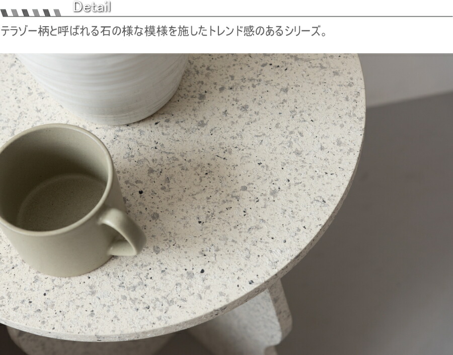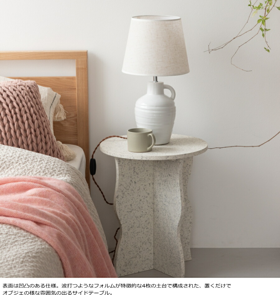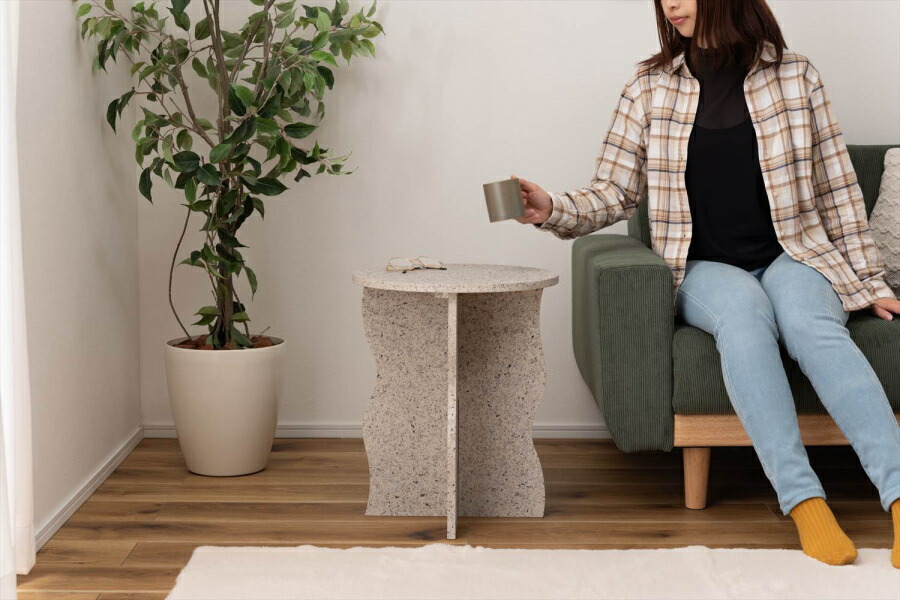 テラゾー柄と呼ばれる石の様な模様を施したトレンド感のあるシリーズ。表面は凹凸のある仕様。波打つようなフォルムが特徴的な4枚の土台で構成された、置くだけでオブジェの様な雰囲気の出るサイドテーブル。裏面フェルトシール付き。