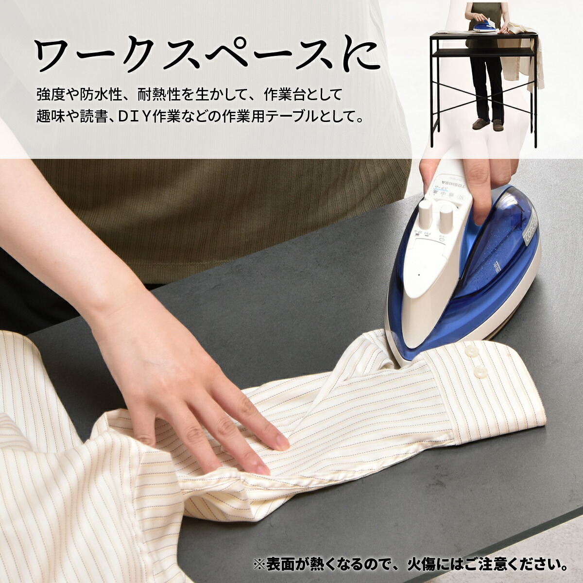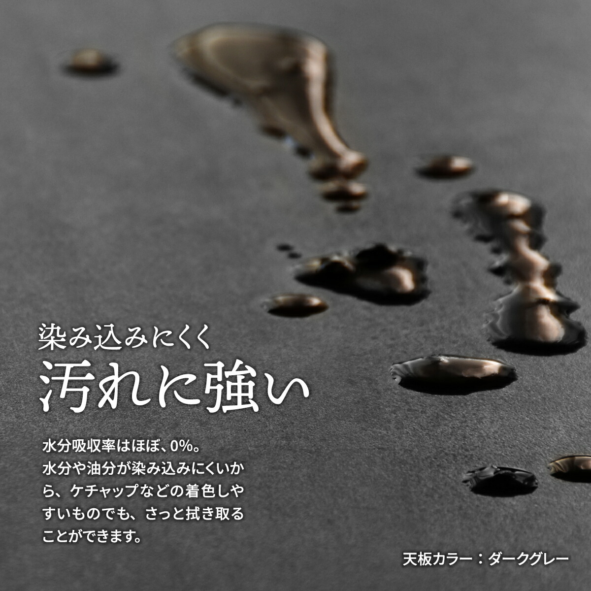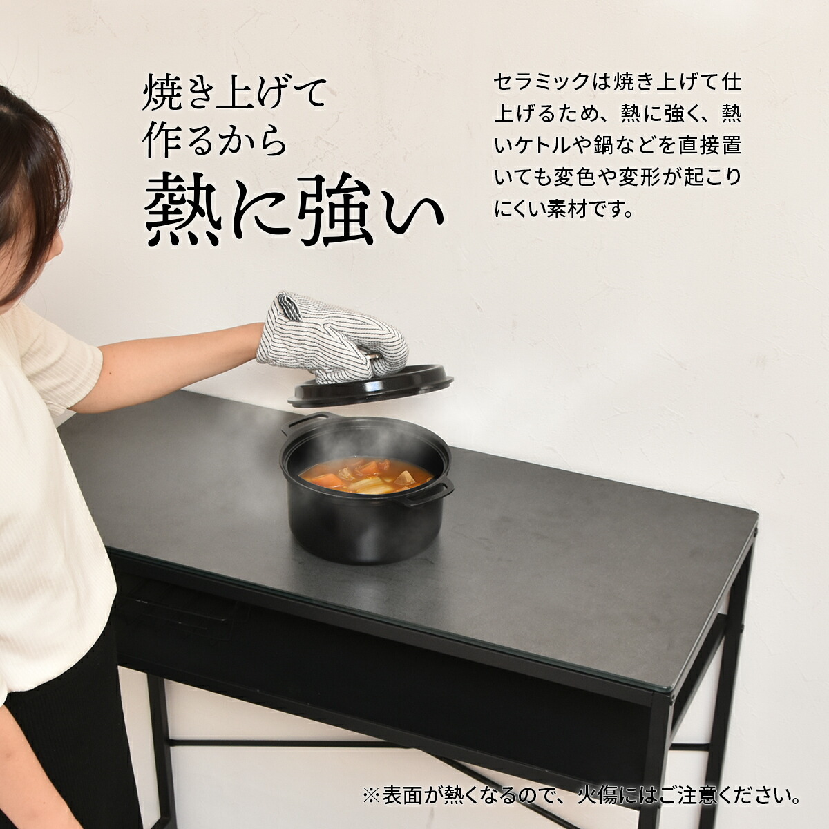 天板ガラスの表面にセラミック焼き付け加工を施したカウンターテーブルです。表面にセラミック焼き付け加工を施しているので、耐火耐熱・表面硬度・防水など機能性は抜群です。天板表面のセラミックが高級感のあるデザインなので、見た目も機能性も備わったおすすめの商品です。天板はセラミック焼き付け加工が施されているので熱に強く、熱いお鍋などを直接置いても変色、変形なく、またキズにも強いので天板をまな板代わりに使ってもキズがつきません。お手入れも簡単で食材や油などの汚れが染み込むことがなく、さっと拭いてお手入れができます。個性的でおしゃれな色合い、触った時の質感など様々な風合いを楽しむことができる魅力的な商品です。