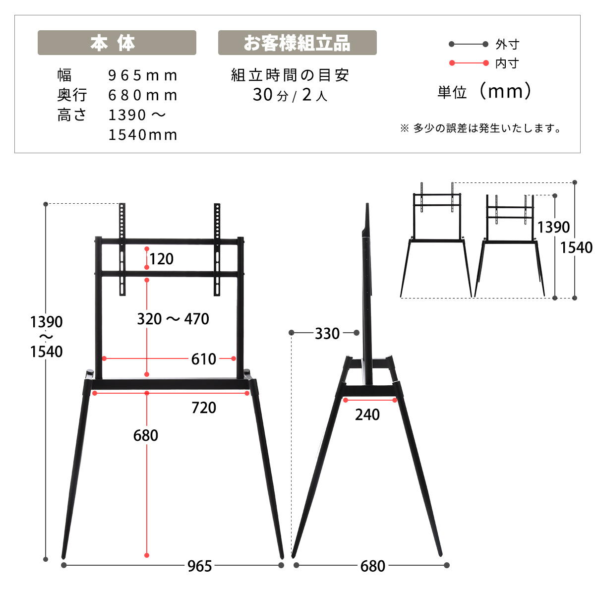 商品サイズ:幅 965 × 奥行 650 × 高さ 1390〜1540 mm