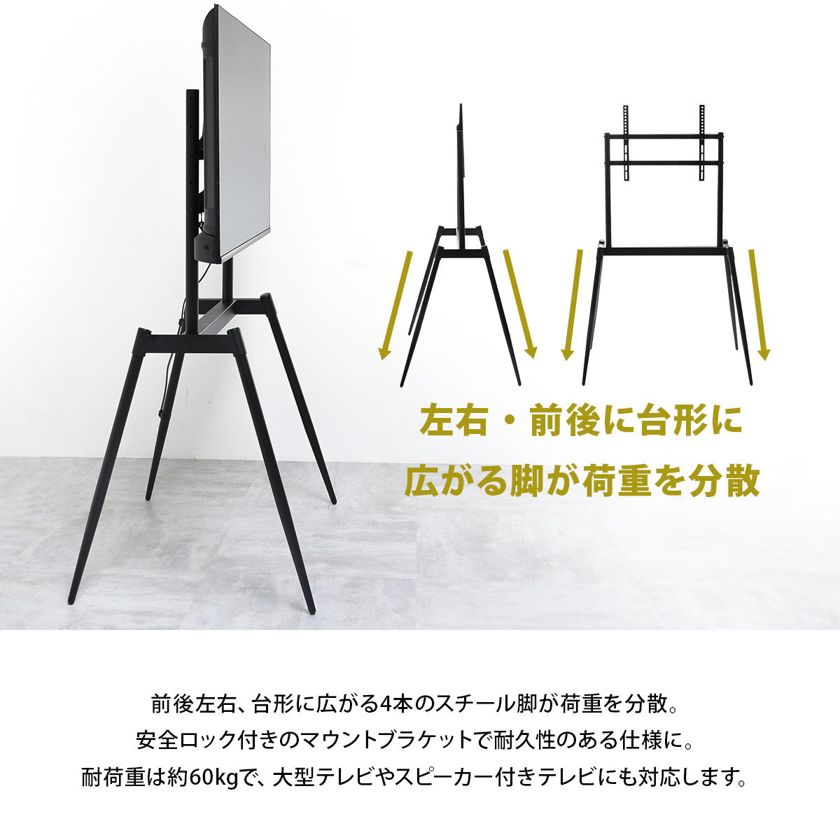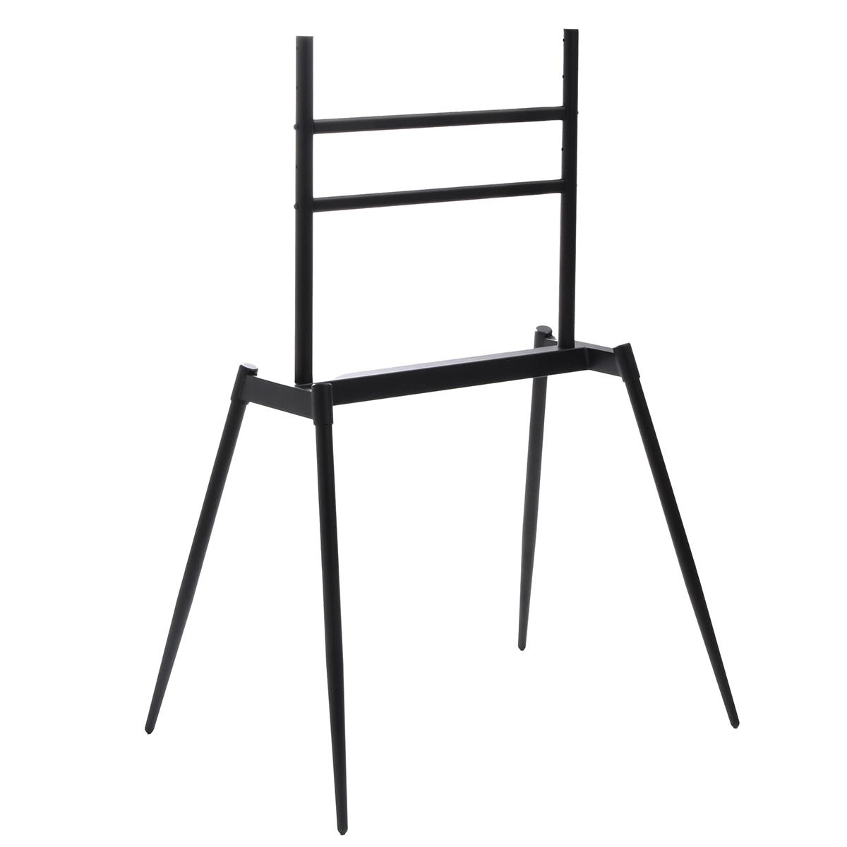 32〜75型までのテレビに対応した、本体耐荷重60kgのイーゼルタイプのテレビスタンド。テレビとイーゼルスタンドを一体化させることで、テレビをインテリアのように演出してくれます。お部屋を引き締める上品なブラックで、シンプルなデザイン。すっきりと開放感のあるフォルムが、スタイリッシュな空間を演出いたします。また、高さ調整が可能で、リビングやダイニング、寝室など様々なシーンに合わせてお使いいただけます。テレビをアートのように飾り、すっきり美しくスマートなお部屋に。