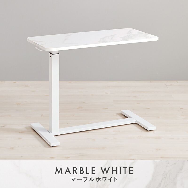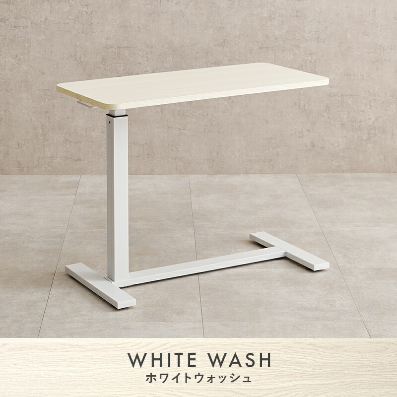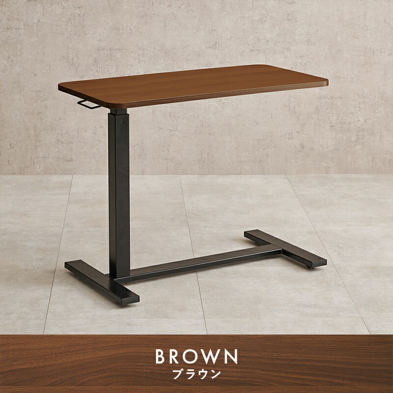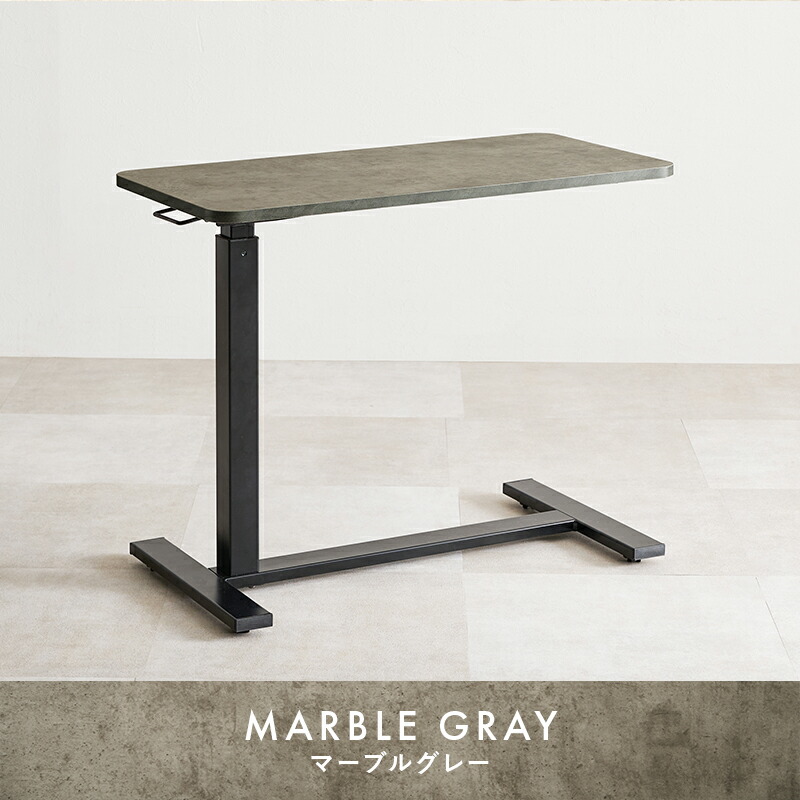 ガス圧式で無段階に高さ調節ができる昇降テーブル。キャスター付きで移動がしやすく、ソファやベッドに座って作業するときも脚が邪魔にならないデザインです