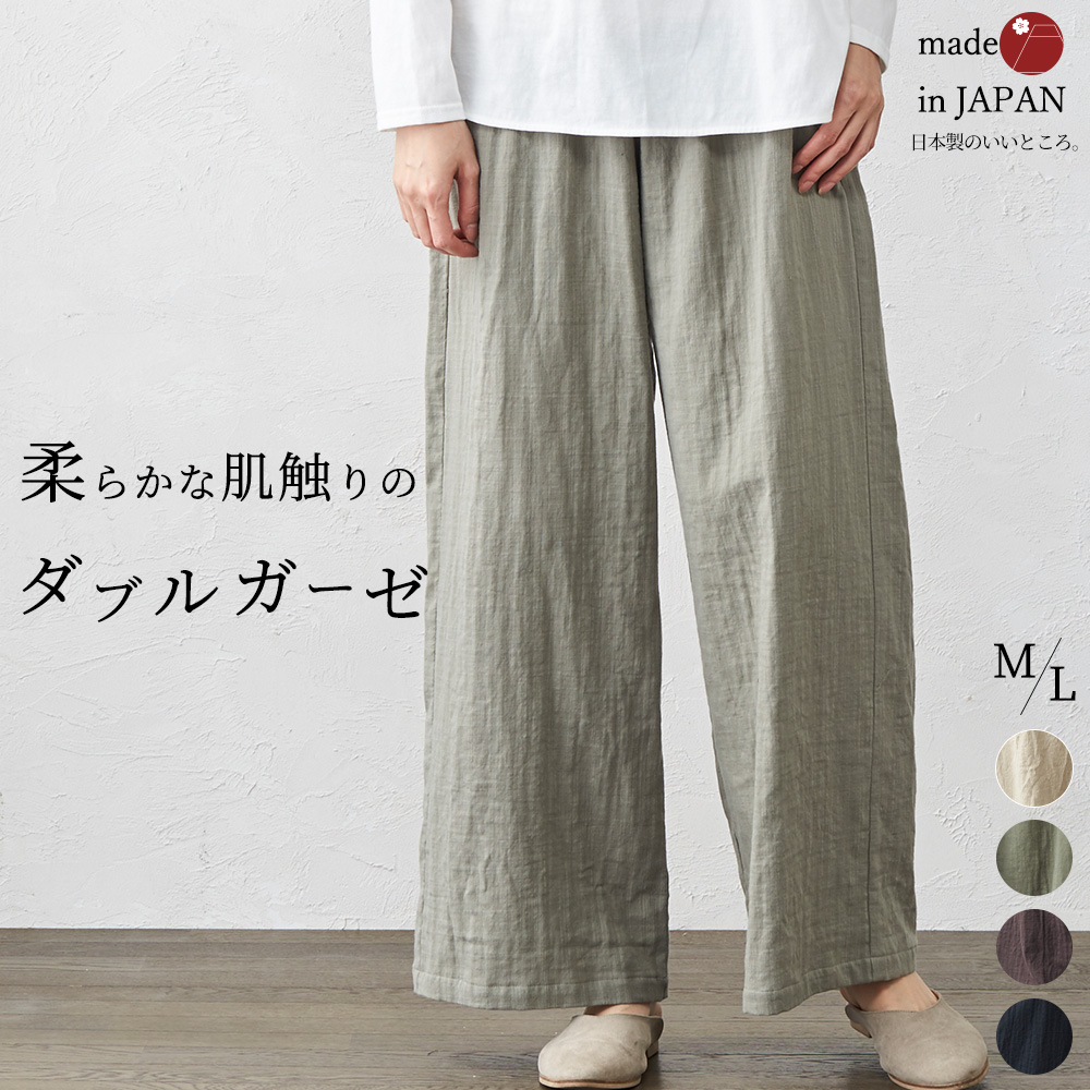 ダブルガーゼを使用した綿100%ワイドパンツ。