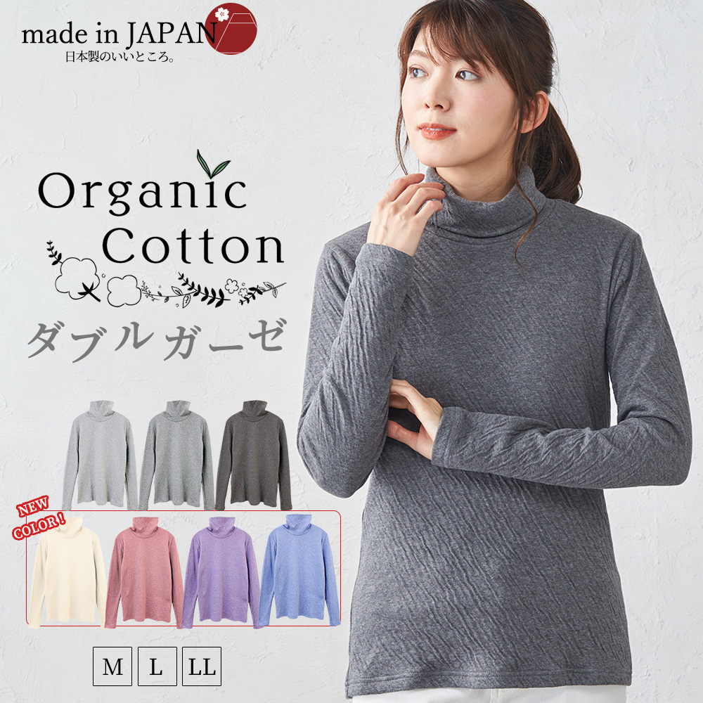 | 商品詳細/その他 | ダブルガーゼ生地が空気を含むからふっくらとやさしく温まります。お肌の弱い方にも安心してご着用いただけるオーガニックコットン100%のハイネックです。 |