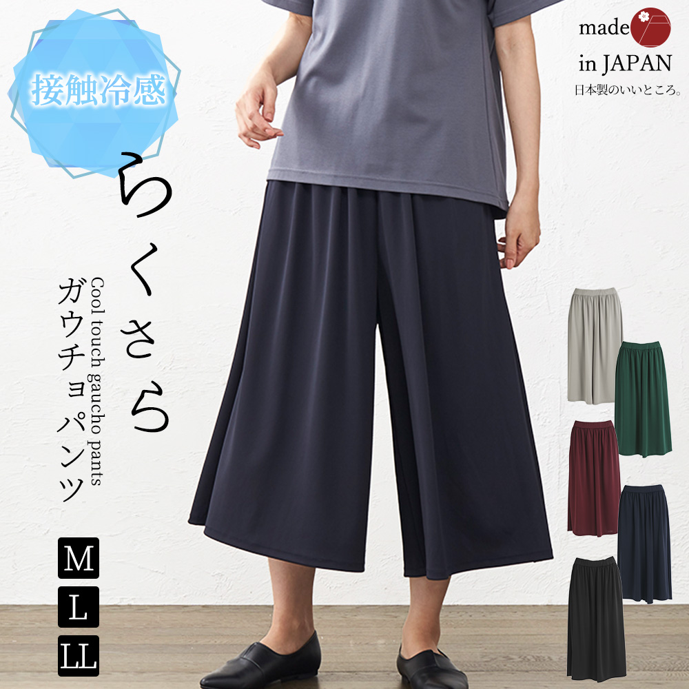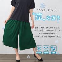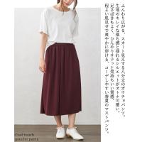 | 商品詳細/その他 | たっぷり生地を使いボリュームを持たせたスカート見えする8分丈ガウチョパンツ。ふんわり揺れる上品な落ち感で、大人の夏のコーデの主役になるアイテムです。穿いた時にひんやり感を感じる接触冷感素材を使用し汗をかいてもさらっと快適な夏に穿きたいアイテムです。脇にポケット、ウエスト内側に紐がついていて機能的にもうれしいアイテムです。 |