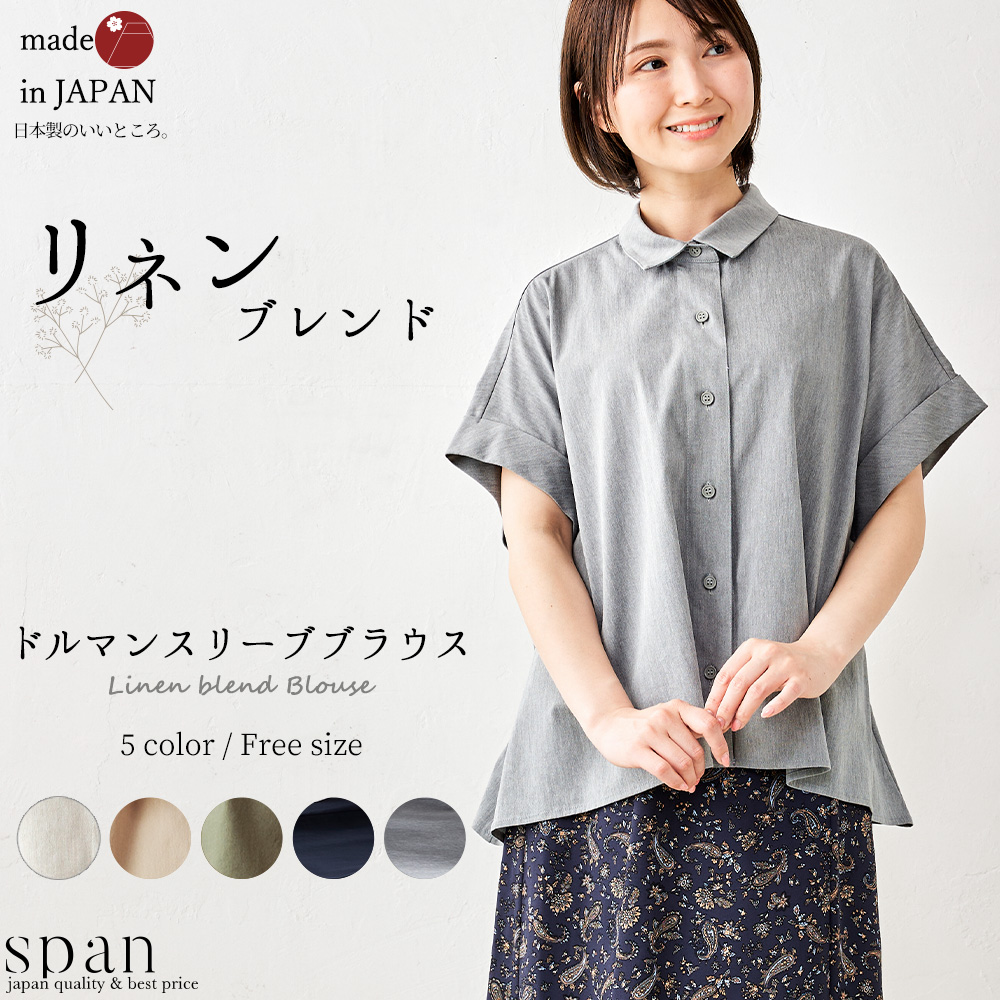 ブラウス シャツ リネン ブレンド 麻 麻混 シャツ シャツカラー ドルマンスリーブ トップス レディース 夏 半袖 5分袖 ゆったり 体型カバー 日本製