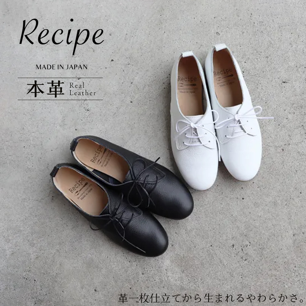 日本製 レザー 本革 レースアップ フラットシューズ ローヒール ぺたんこ 靴 柔らかい 痛くない 軽量 外反母趾 レディース recipe レシピ ブラック ホワイト