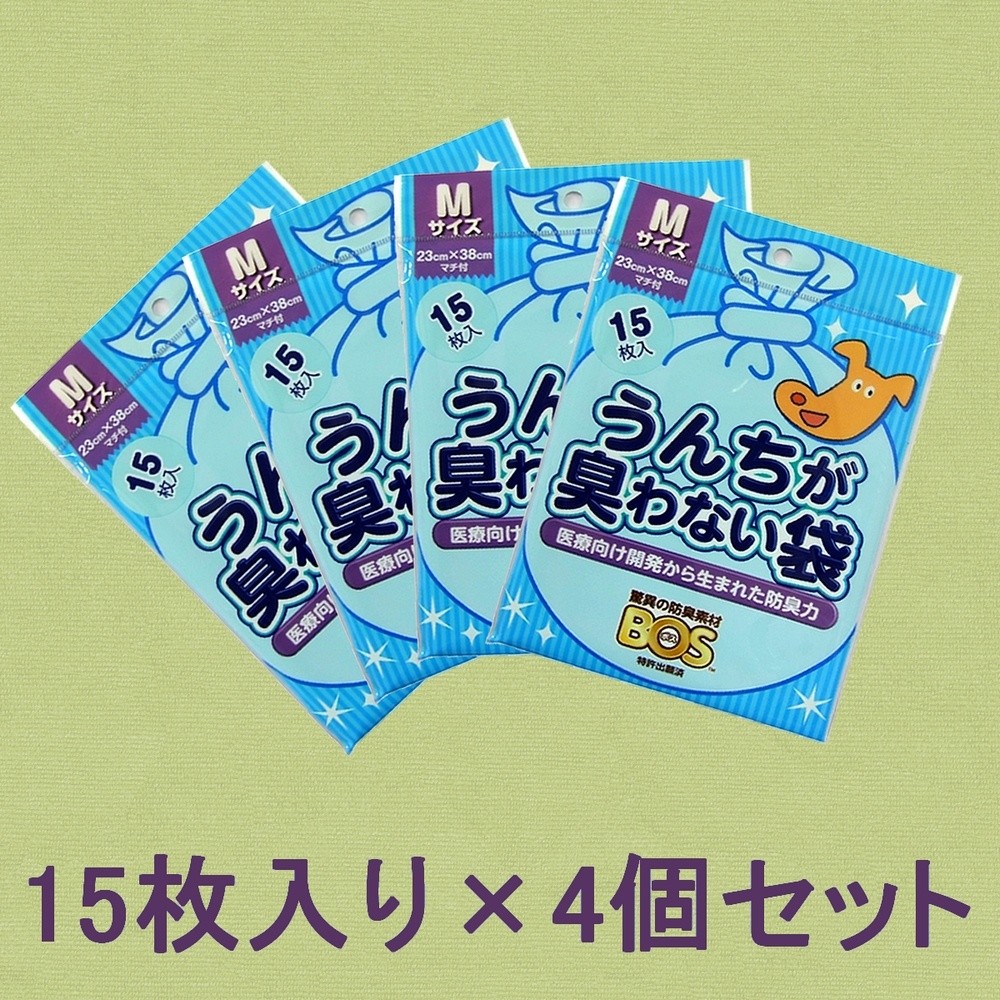 【15枚入り×4袋セット】驚異の防臭素材BOS(ボス)うんちが臭わない袋 Mサイズ 小分け袋15枚入 ペット用うんち処理袋/マナー袋 犬・猫