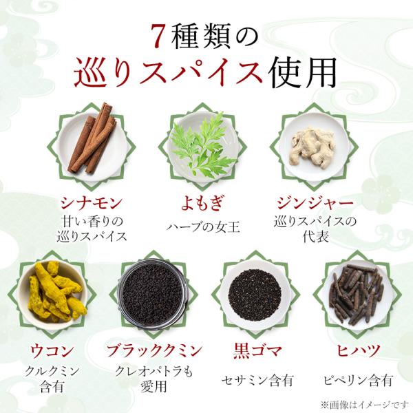 ウコン 、 黒ゴマ 、 ブラッククミン 、 ヒハツ 、(一部に ごま を含む)