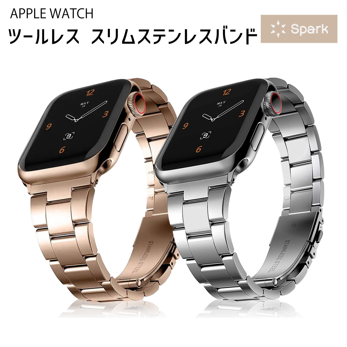 アップルウォッチ専用の工具不要なスリムデザインステンレスバンドです。