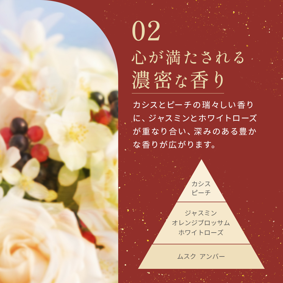 | 使い方 | Step1 髪全体をとかし、髪をなめらかにする。 Step2 髪を十分に濡らし、毛先から徐々に髪全体に剤が行き渡るまでまんべんなく洗います。 Step3 コームを頭頂部の方向に向かって垂直に入れ、濡れた髪をとかします。 Step4 髪を乾かした後で、髪全体をブローし、スタイリングやコーミングをします。 ※ヘアミルクやヘアオイルとの併用を推奨します。 |
