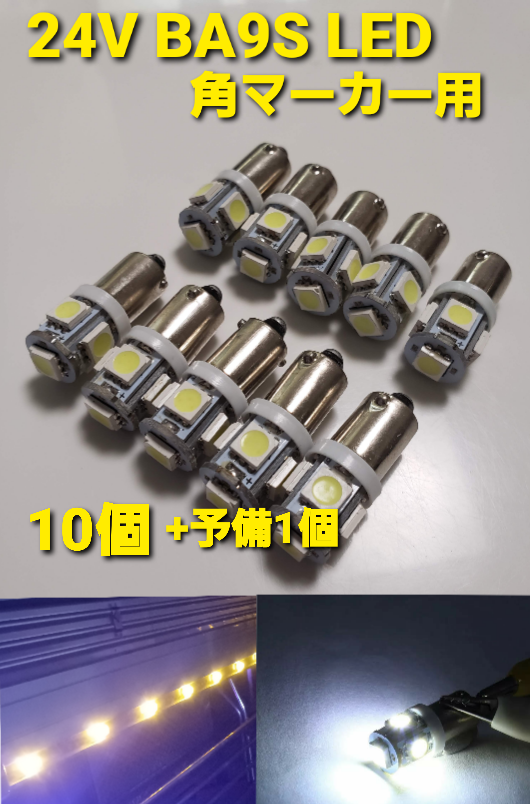 | 主な仕様 | BA9S 24V 角マーカー 球 5050SMD LED 5連 G14 ホワイト (白) 10個+予備1個全長30ミリ 口金直径9ミリ10個セット+予備1個トラック用角マーカー サイドマーカー ルームランプ、、ナンバー灯、ライセンスランプ、ドアカーテシ |
