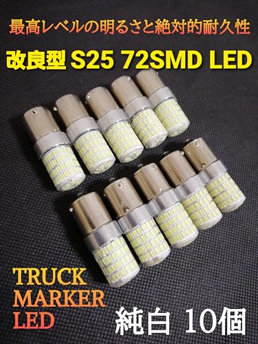 | 主な仕様 | 耐久性改良型 眩しいほど明るい。そして切れない絶対的長寿命LED。3014LED×72発搭載スーパーブライト耐久性改良型 S25 72SMD LED トラック マーカー球 ホワイトトラック用 マーカーランプ用 LED 電圧範囲10V~50V (12V 24V兼用)3.2W トラック 普通自動車全長約4.5cm 直径約1.2cm |