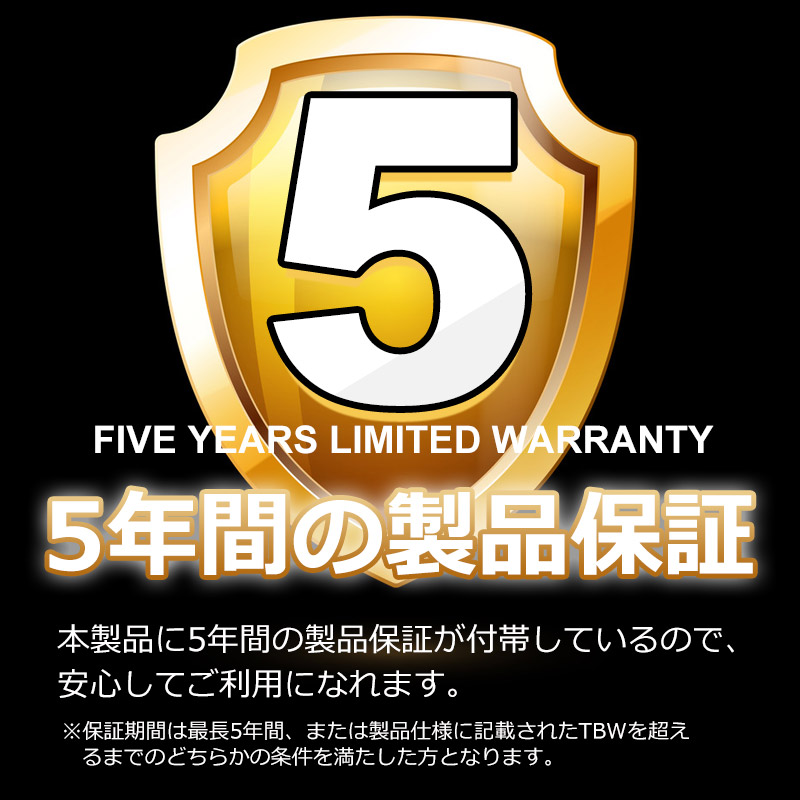 保証期間:5年間(保証は、最初の購入日から5年間、または製品データシート上に記載されている最大書き込みバイト総数400Terabytesが書き込まれるまでのうち、いずれか早く到達する日まで有効です。 ご購入前に必ずご確認ください。)
