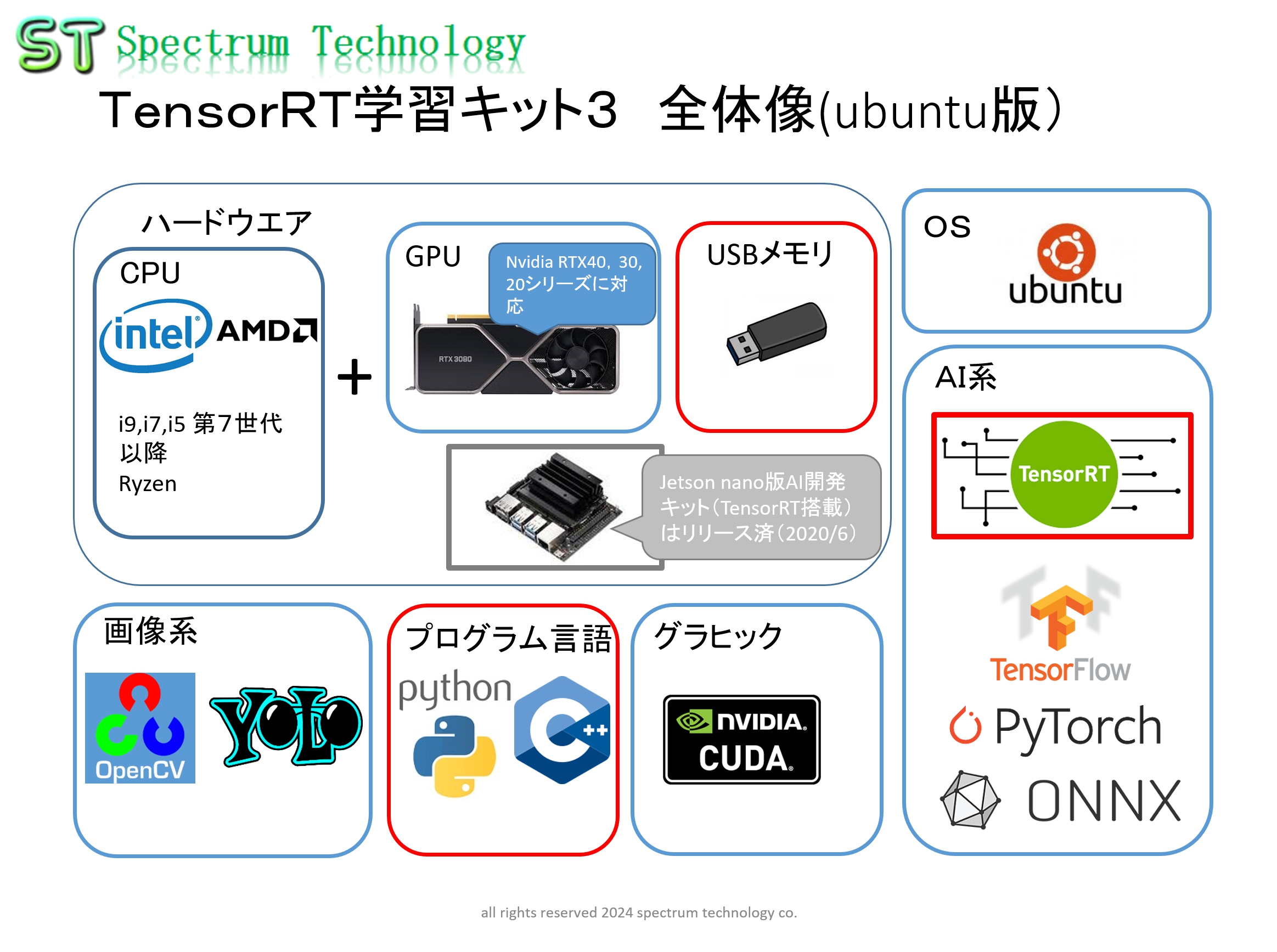 AIは、今後、自動運転、画像認識など実用段階に入りますが、今後エッジデバイスでの高速処理が必須になります。その高速化のために、Nvidiaが開発したTensorRTの学習・開発キットを提供します。AIスキルの中・上級者が対象となります。学校から企業まで幅広く、安価にご利用頂けます。これまでは、Nvidiaの専用デバイス(Jetson等)でのみ動作していましたが、今回汎用のデスクトップPC等(Ubuntu,Windows)で使用可能。