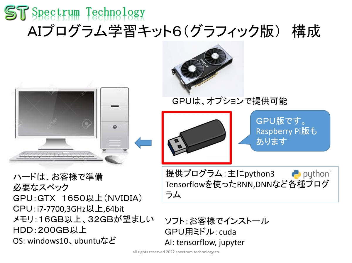 Windows10又はubuntuとGPUを使って、グーグル開発のディープラーニング・ソフトであるTensorflow(.js),フェースブック開発のPytorch及びPythonの基礎を学習することができます。対象は、人工知能(AI)の核であるディープラーニングを初めて学ぶ方及び中級者となります。GPUにより、本格的に利用できます。Pi版に比べて5倍速から150倍速の速度で学習できます。