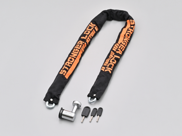 焼き入れ加工済みのスチール合金製チェーン。ノコギリやカッター、ハンマーなどによる破壊に強く、愛車を盗難から守ります。細めのφ8チェーンを使用することでφ12チェーンより軽く、施錠時にもたつかず使いやすい。ロック本体はコンパクトなので、ディスクロックとしても携帯できます。