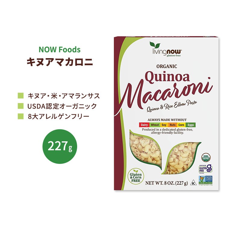 ●人々がより健康的な生活を送れるようにするとの使命のもと、手頃な価格で高品質なナチュラル商品を提供する「NOW Foods」。扱う商品はサプリ、美容製品、エッセンシャルオイル、スポーツ用栄養食品、ペット向け栄養補助食品など、多岐にわたります。また、数々の賞を受賞しており、その品質の高さが伺えます。 ●海外セレブやモデルさんたちが健康維持や美容目的で食事に取り入れたことからスーパーフードとして話題を呼んだキヌア。その理由は何といっても栄養価の高さ。白米や小麦などと比較して、たんぱく質は植物性たんぱく質の中でもトップクラス。鉄分・マグネシウム・カルシウムも多く含まれ、食物繊維も豊富、その上グルテンフリーとあらば、食生活に気を配っているモデルさんたちが目を付けないわけがない! ●味もクセがなく和風にも洋風にも合い、プチプチとした食感が満腹感を与えてくれるのも魅力♪ ●キヌア・米・アマランサスという3つのシンプルなオーガニック原料で作られたパスタは、グルテンフリーにありがちなボソボソ感がなく従来のパスタに期待される美味しさと食感!常備しておけば、サラダやスープ、グラタンやスナックなど味付けを変えるだけでアレンジ自在! ●一般的な8大アレルゲンを含まずアレルギー対応の専用施設で製造されているので、幅広い層の方にお楽しみいただけます◎ ※USDA認証オーガニック / Non-GMO (非遺伝子組換え) / ビーガン仕様 / コーシャ認証 / ハラール認証 / 乳製品不使用 / 卵不使用 / 大豆不使用 / グルテンフリー / トウモロコシ不使用 / 砂糖不使用 / ナッツ不使用 / 低ナトリウム | ||