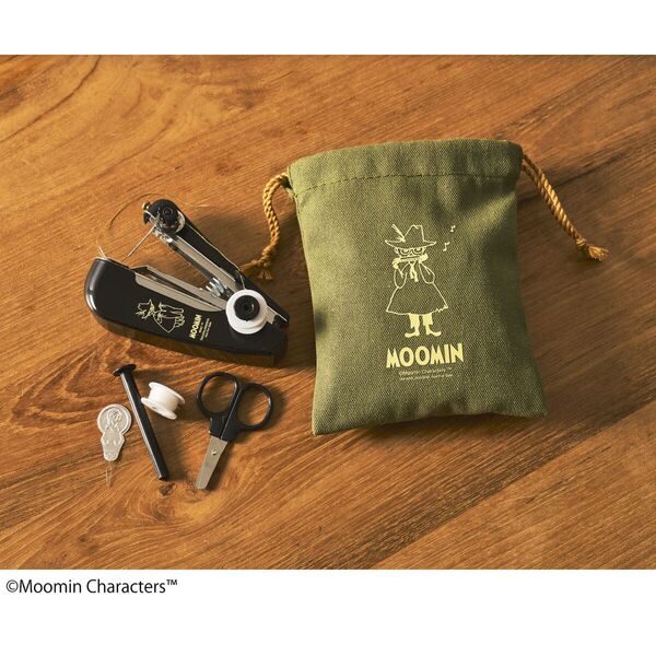 スナフキンのデザインがされた収納用の巾着に、ハンディミシンや糸切はさみなどを収納できます。